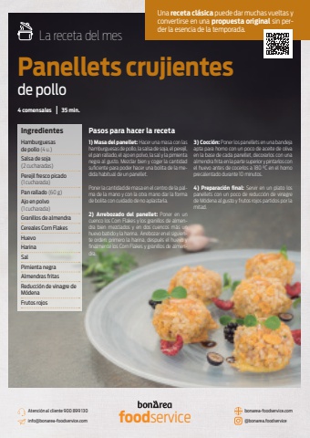 1) Masa del panellet: Hacer una masa con las hamburguesas de pollo, la salsa de soja, el perejil, el pan rallado, el ajo en polvo, la sal y la pimienta negra al gusto. Mezclar bien y coger la cantidad suficiente para poder hacer una bolita de la medida habitual de un panellet. Poner la cantidad de masa en el centro de la palma de la mano y con la otra mano dar la forma de bolita con cuidado de no aplastarla. 2) Arrebozado del panellet: Poner en un cuenco los Corn Flakes y los granillos de almendra bien mezclados y en dos cuencos m%u00e1s un huevo batido y la harina. Arrebozar en el siguiente orden: primero la harina, despu%u00e9s el huevo y finalmente los Corn Flakes y granillos de almendra. 3) Cocci%u00f3n: Poner los panellets en una bandeja apta para horno con un poco de aceite de oliva en la base de cada panellet, decorarlos con una almendra frita en la parte superior y pintarlos con el huevo antes de cocerlos a 180 0C en el horno precalentado durante 10 minutos.4) Preparaci%u00f3n final: Servir en un plato los panellets con un poco de reducci%u00f3n de vinagre de M%u00f3dena al gusto y frutos rojos partidos por la mitad. Pasos para hacer la recetaLa receta del mesPanellets crujientes de polloHamburguesas de pollo (4 u.)Salsa de soja (2 cucharadas)Perejil fresco picado (1 cucharada)Pan rallado (60 g)Ajo en polvo (1 cucharada)Granillos de almendraCereales Corn FlakesHuevoHarinaSalPimienta negraAlmendras fritasReducci%u00f3n de vinagre de M%u00f3denaFrutos rojosIngredientes 4 comensales 35 min. foodservice Atenci%u00f3n al cliente 900 899 130 info@bonarea-foodservice.combonarea-foodservice.com @bonarea.foodserviceUna receta cl%u00e1sica puede dar muchas vueltas y convertirse en una propuesta original sin perder la esencia de la temporada.